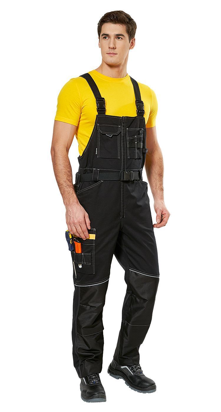 Полукомбинезон с яркими элементами фурнитуры и множеством функциональных деталей и карманов: