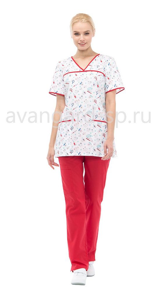 Блуза прямого силуэта из принтованной ткани с V-образным вырезом горловины.