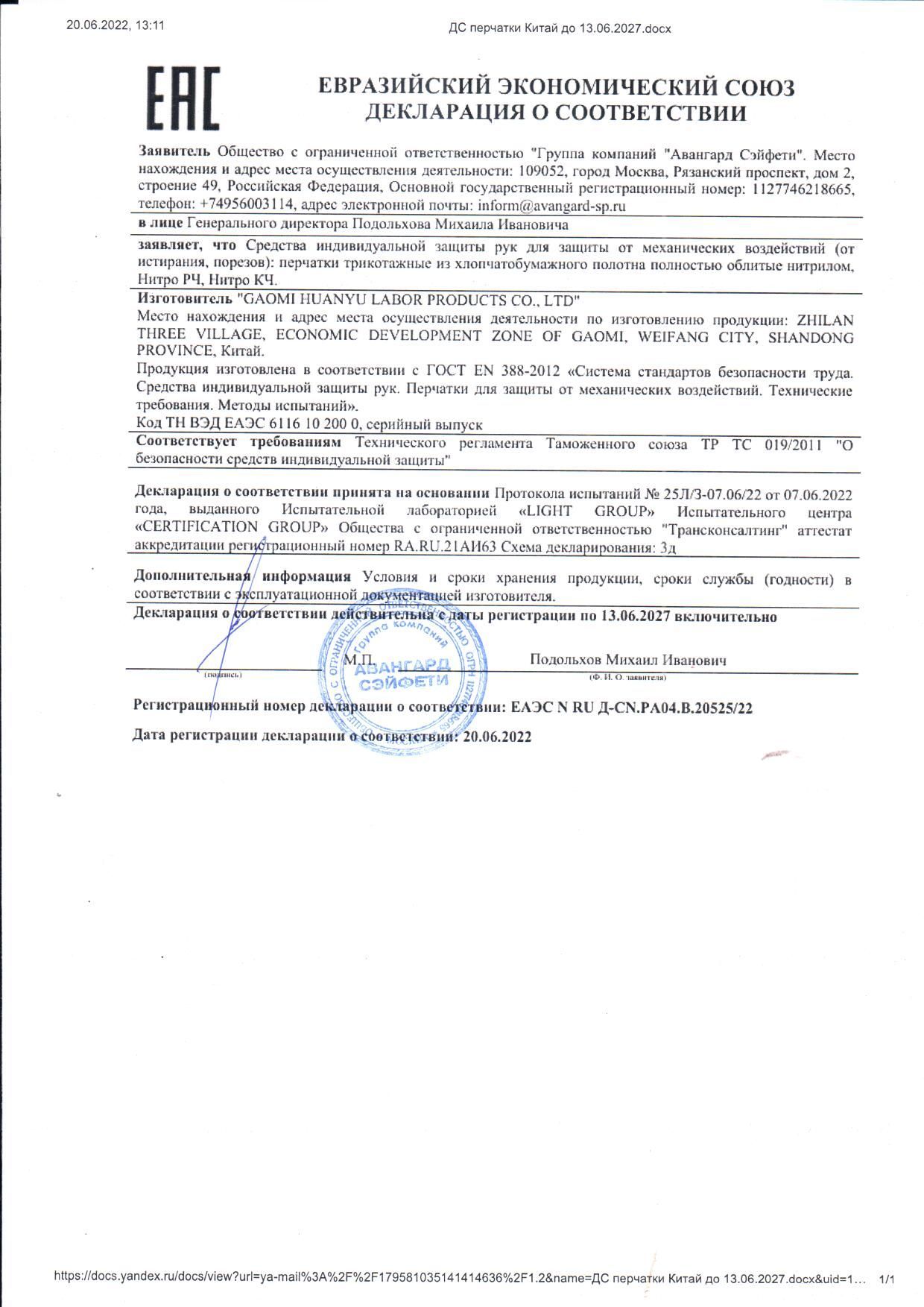Перчатки из хлопкового трикотажа с ворсистым начесом на внутренней поверхности с частичным покрытием из синего нитрилового каучука с пришивной плотной манжетой типа крага. Предназначены для использования во всех сферах промышленности для защиты рук от механических повреждений, стойкие к воздействию нефтепродуктов, и не концентрированных кислот и щелочей (К50; Щ50).